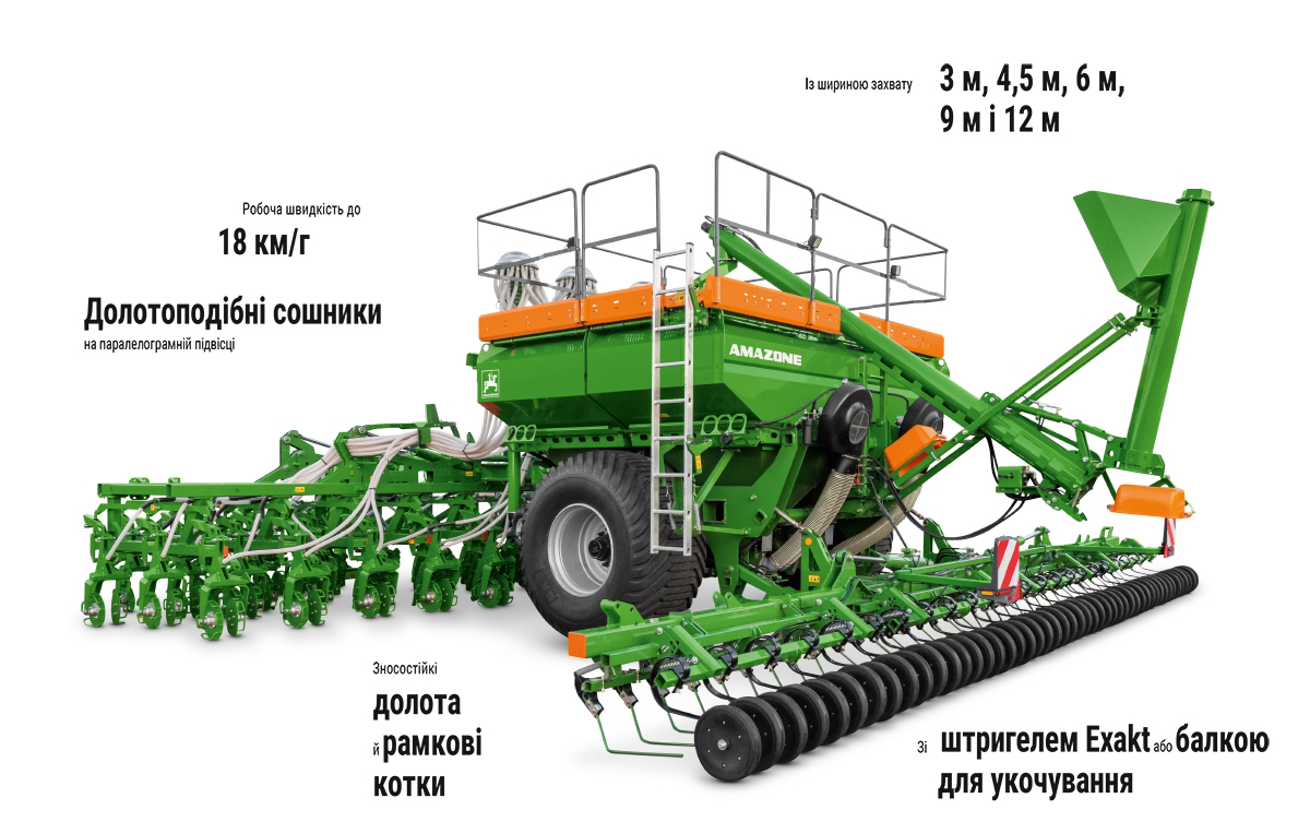 - Ширина захвату 12 м, застосовується за потужності трактора від 450 к. с.